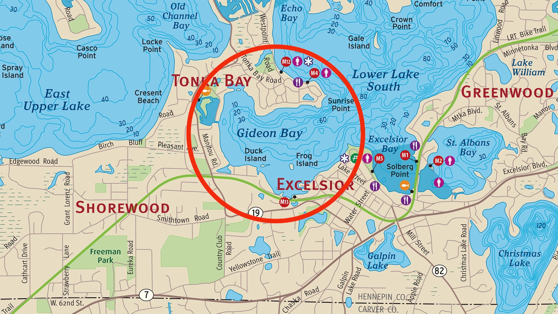 Located west of Excelsior Bay, Gideon’s Bay borders the cities of Excelsior, Tonka Bay, and Shorewood, covering around 160–185 acres with a depth of about 57 feet and excellent water clarity.